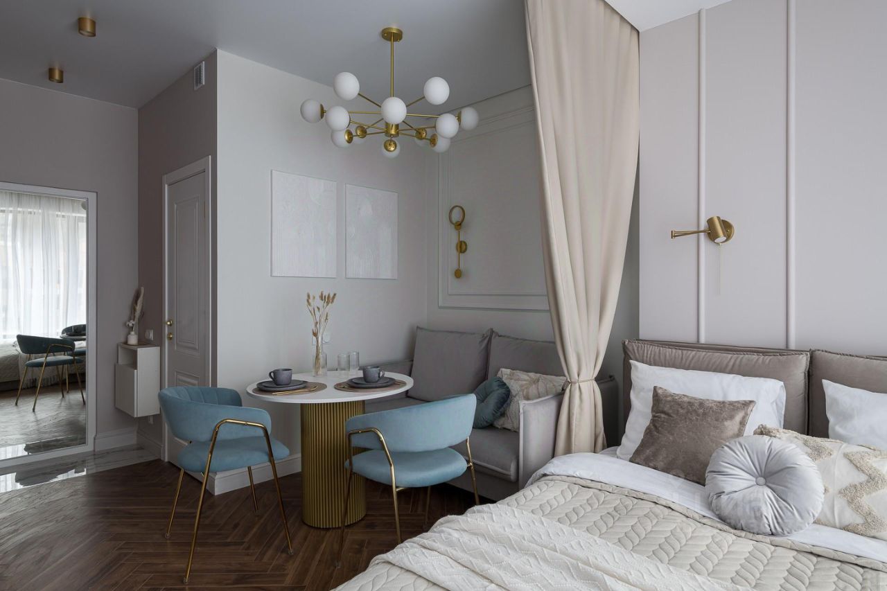 Обеденная зона на двоих, зона отдыха, декор, шторы — всё выдержано в едином стиле.