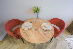 Кухня с чайником, фильтром для воды, индукционной плитой, духовкой, кастрюлей, сковородкой, столовыми приборами, штопором, кружками, бокалами для вина, стаканами, ножами, холодильником с морозилкой, микроволновкой, столом для обеда, двумя стульями.