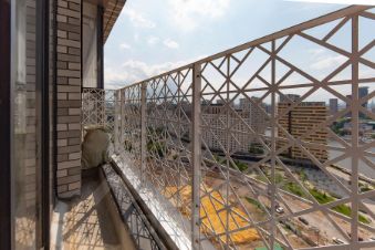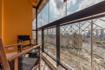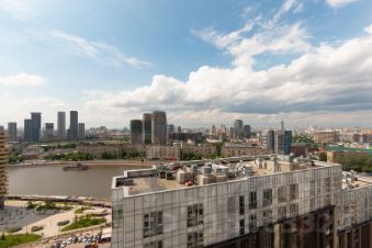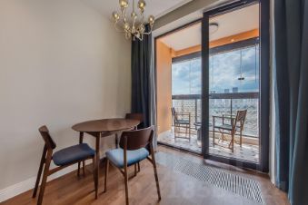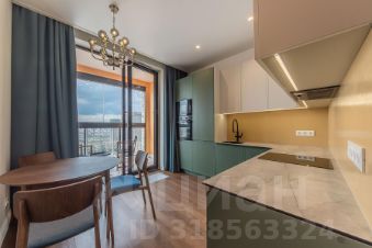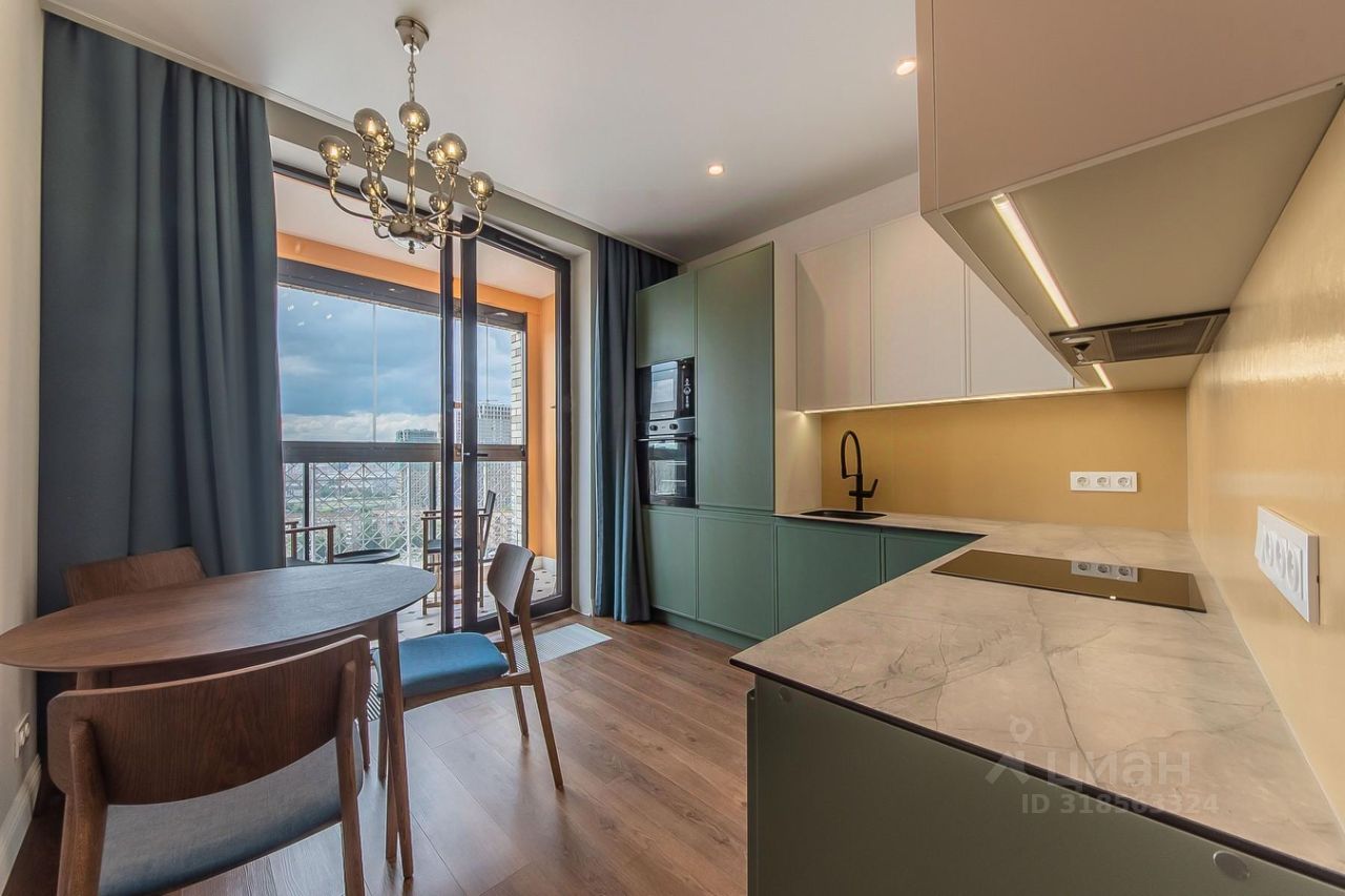 Просторная кухня 12 кв.м. с застеклённой лоджией, из которой открывается панорамный вид на Москва-реку. Кухонный гарнитур встроенный. Вся бытовая техника фирмы KORTING.