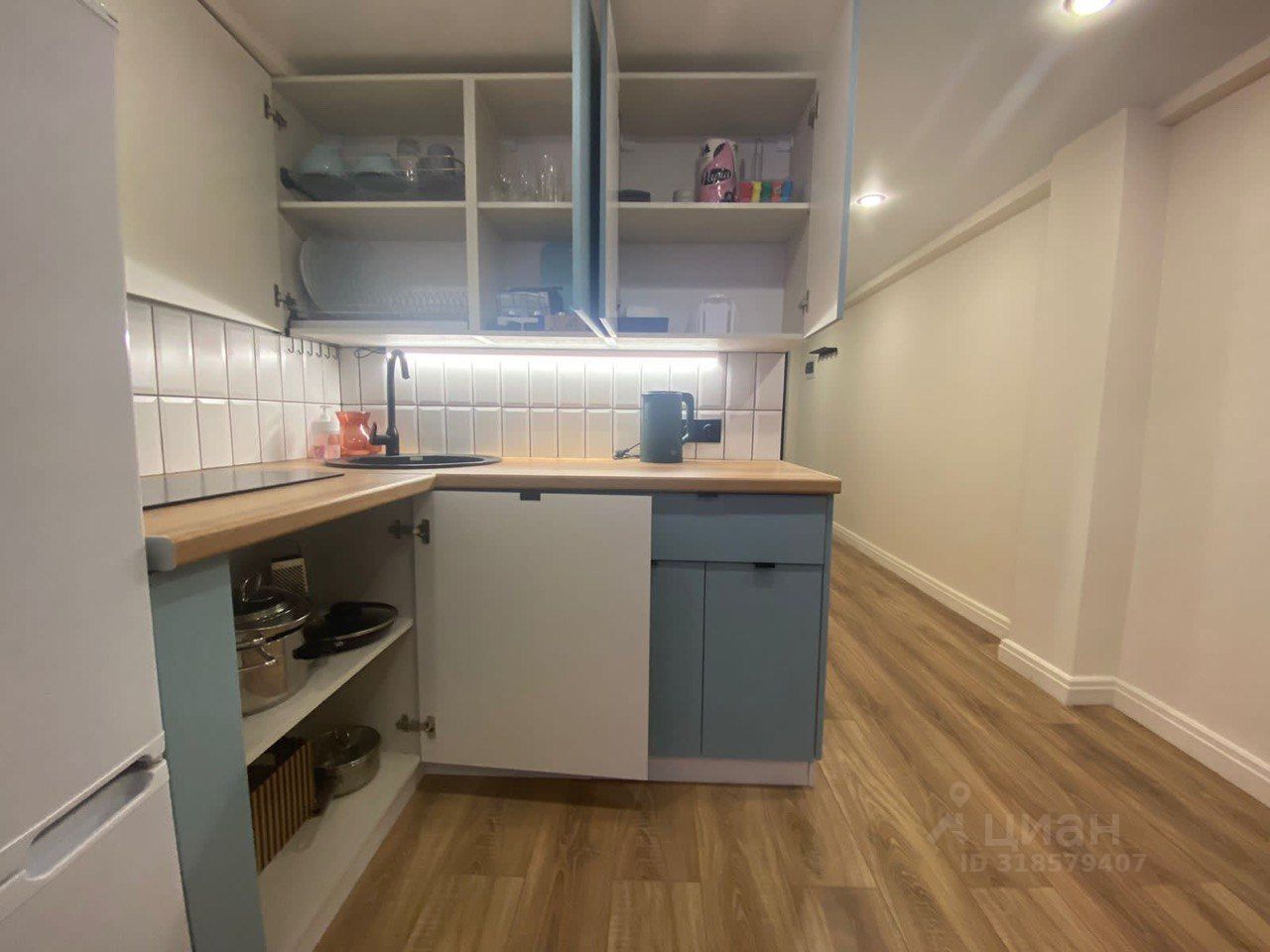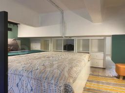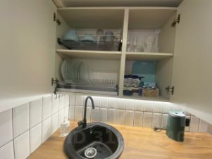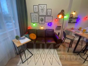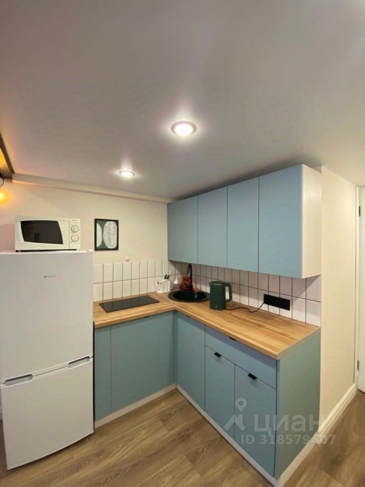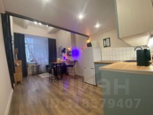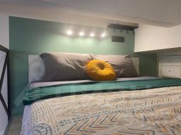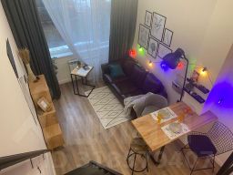Студия со стильным ремонтом. При входе- гардеробная. Санузел с душевой и стиральной машиной. Встроенная кухня с плитой и всем необходимым для жизни. Холодильник, СВЧ-печь, барная стойка. В зоне гостиной, раскладывающийся, кожаный диван. На втором уровне кровать с ортопедическим матрасом и стеллажами для хранения. Высокий первый этаж, окна выходят в тихий двор.
