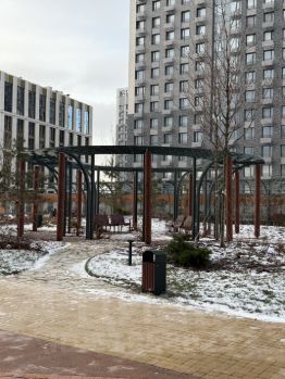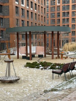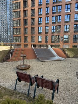 Окна квартиры выходят на улицу, открывая приятный вид. На территории дома благоустроено пространство для отдыха и прогулок.