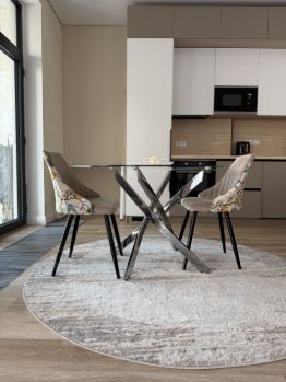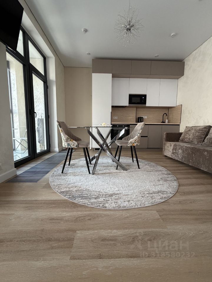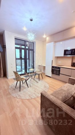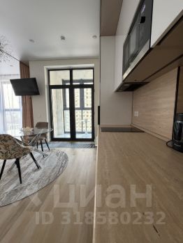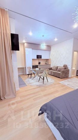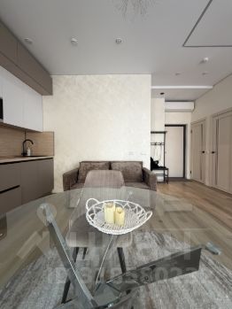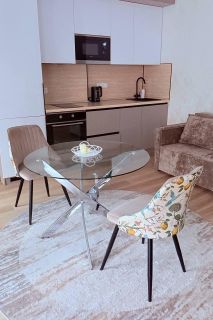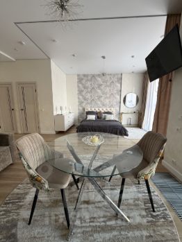Полностью готова к комфортному проживанию. В комнате и на кухне есть вся необходимая мебель. Из техники в квартире присутствуют кондиционер, холодильник, посудомоечная и стиральная машины, а также телевизор. Центральное кондиционирование.