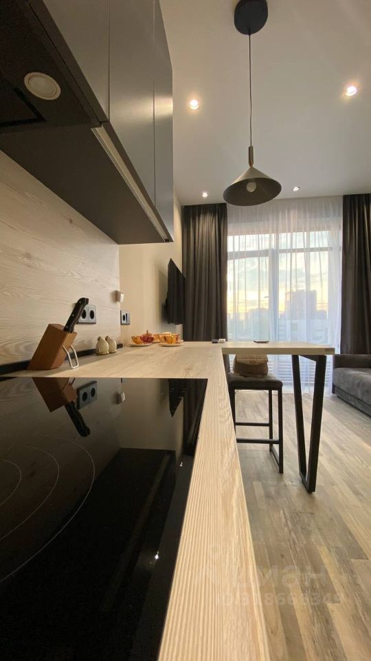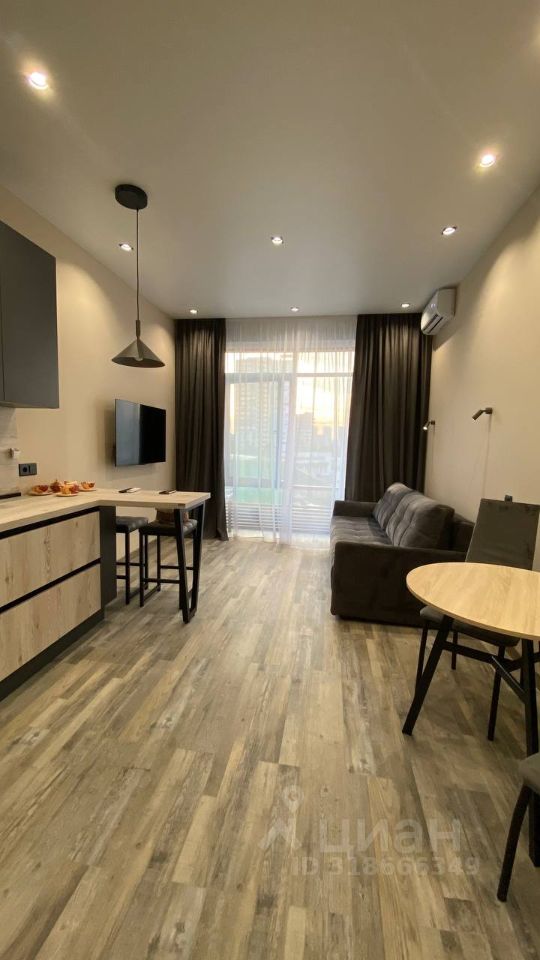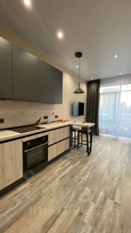 В кухне-гостиной установлен кухонный гарнитур с огромным количеством пространств для хранения, с холодильником, посудомоечной машиной и мини барной стойкой, столиком со стульями и большим раскладным ортопедическим диваном, телевизором, кондиционером.