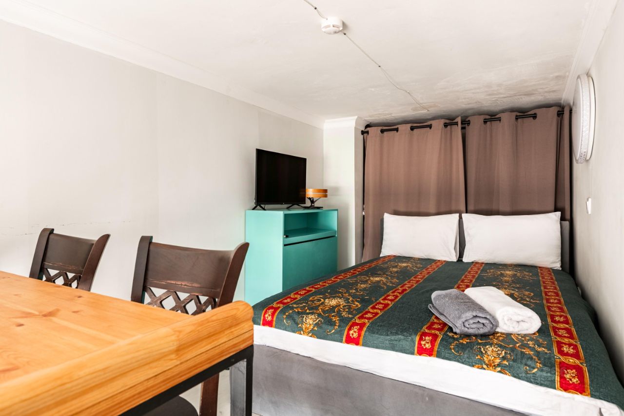 Компактная квартира с современным дизайном оборудована двуспальной кроватью с ортопедическим матрасом, блэкаут шторами, чистым постельным бельем, тапочками, шкафами для одежды, посудой на 2 персоны, Wi-Fi и телевидением с заботой о Вашем комфорте.