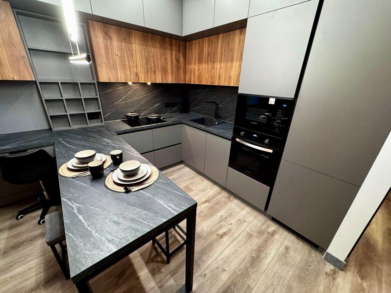 Кухня с плитой, холодильником, микроволновкой, духовкой, посудомойкой, электрическим чайником, а так же всей необходимой посудой для приготовления.