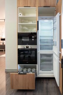 Просторная кухня оборудована мебелью, всей необходимой техникой (духовка, встроенные свч, холодильник и посудомоечная машина, чайник и капсульная кофемашина), посудой ресторанного уровня и утварью для приготовления блюд. Также на кухне размещена станция Xiaomi Mijia с функцией сухой и влажной уборки и системой самоочистки, фильтр для питьевой воды с подачей через смеситель.