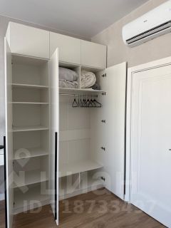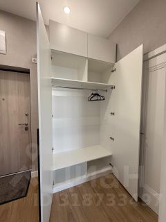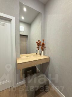 Достаточно мест для хранения: два вместительных шкафа (в комнате и в прихожей). Напротив входной двери зеркало в полный рост, подвесная тумба и трендовый пуфик букле на ножках.