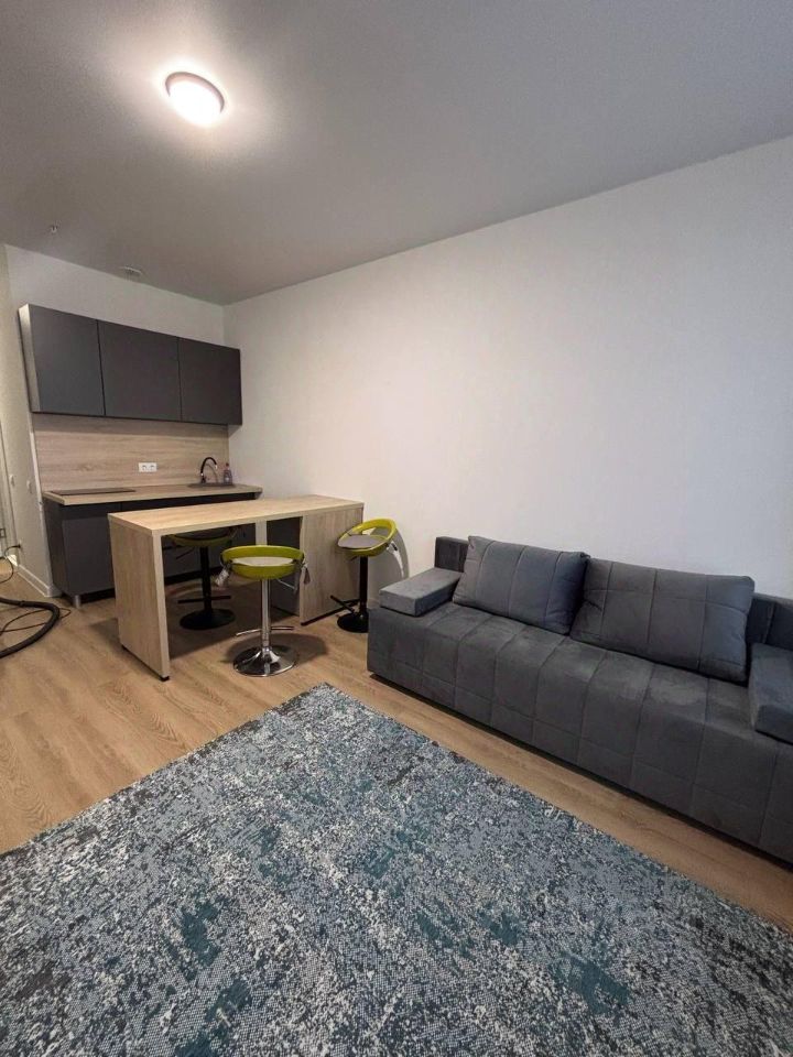 В квартире выполнен евроремонт, поэтому всё выглядит современно и стильно. Просторная студия обставлена необходимой мебелью как в жилой зоне, так и на кухне. Для вашего удобства есть вся необходимая техника: холодильник, телевизор и стиральная машина. Санузел совмещённый, с полноценной ванной. Окна выходят на улицу, что обеспечивает хорошее естественное освещение.