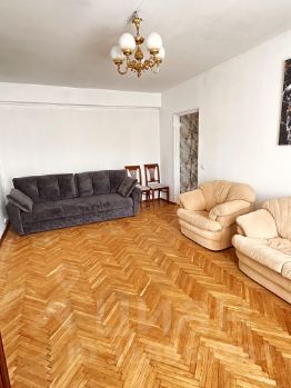 Уютная трёхкомнатная квартира с двумя изолированными спальнями и проходной гостиной. Окна выходят в тихий двор. Большой балкон на две комнаты.