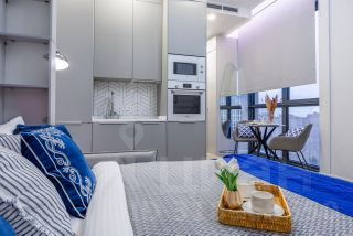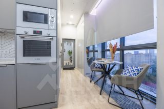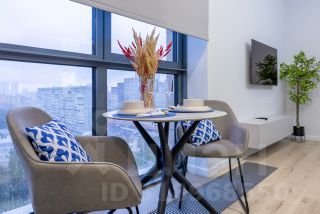 - Панорамные виды на город и современный дизайнерский интерьер.