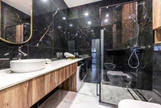 - Ванная комната с душевой кабиной, тапочками, феном, шампунем, мылом, гелем для душа, зубными щетками и пастой. Есть стиральная машина и утюг.