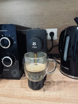 Кухонная зона: стеклокерамическая плита, микроволновая печь, чайник, кофемашина с капсулами Неспрессо, холодильник.