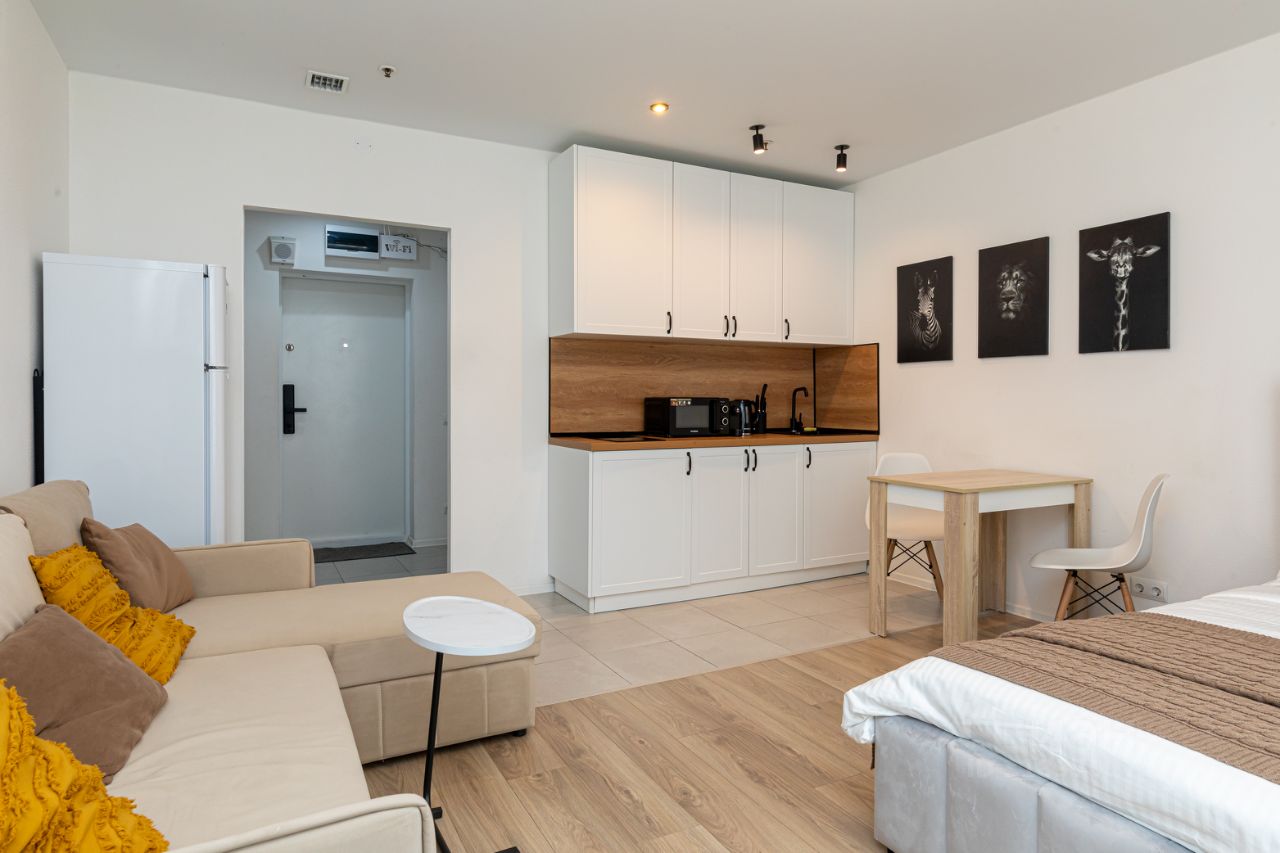 В студии: двуспальная кровать с ортопедическим матрасом (140х200), раскладной диван (140х200), Wi-Fi и Smаrt-ТV