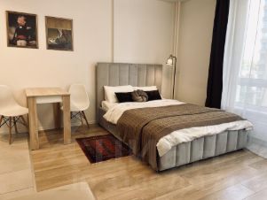 Вас ждет просторная студия с двуспальной кроватью с ортопедическим матрасом (160х200), и раскладным диванным уголком (140х200), с комфортом могут разместиться до 4х гостей.