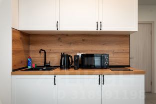 Кухонная зона: стеклокерамическая плита, микроволновая печь, чайник, кофемашина с капсулами Неспрессо, холодильник с морозильной камерой.