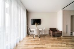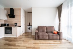 кондиционер, телевизоры smart TV со всеми необходимыми приложениями и браузером, WiFi, фен, утюг, гладильная доска, сушилка для вещей, стиральная машина, большое количество мест для хранения вещей.