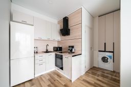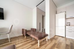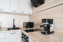 В кухонной зоне установлена Кофемашина, варочная панель, чайник, микроволновка, духовой шкаф, фильтр для воды, посудомоечная машина, холодильник, а также имеется необходимая для приготовления и приёма пищи посуда.