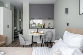 Стильная студия в Москве в ЖК Салют по проспекту Ленинский 158. 11-15 минут пешком до станций метро Тропарево и Юго-Западная. Рассчитана на 2 гостей. Круглосуточное заселение и полный пакет документов для командированных гостей.