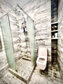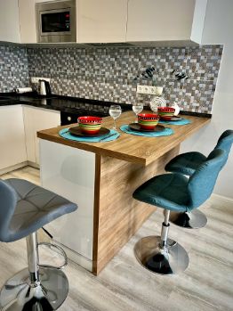 Двуспальная кровать 160 см, диван двухместный 140 см, телевизор 55', Sart TV, шкафы (много места для хранения вещей): шкаф купе в спальне и гардероб, комод и две тумбочки, кухня полностью укомплектована техникой, чайник, столовые приборы, посуда, кастрюля, сковорода, чай, кофе, гель для душа, шампунь, мыло, комплект белоснежных полотенец и постельного белья, стиральная машина, утюг, гладильная доска, фен.