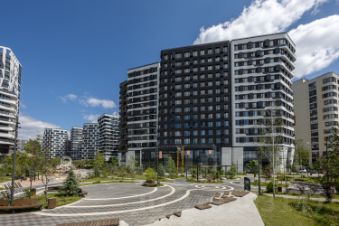 Территория ЖК благоустроена для прогулок: фонтаны, скамейки, уютные кафе и магазины.
