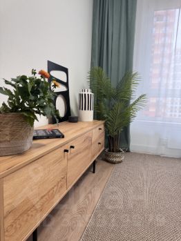 Интерьер выполнен в приятных природных зелёных оттенках, которые подарят ощущение уюта и станут вашим островком спокойствия в ритме мегаполиса.