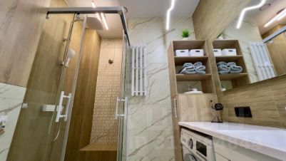 душевая, стиральная машина с функцией сушки, полотенца, шампунь, мыло, фен, сушилка, гладильная доска.