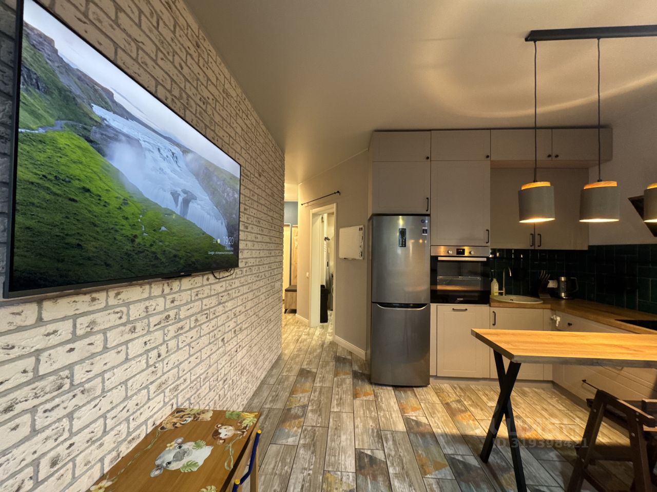 На кухне-гостиной также есть раскладной диван, большой двухкамерный холодильник, посудомоечная машинка, духовой шкаф, большой телевизор.