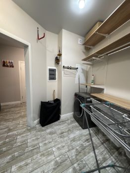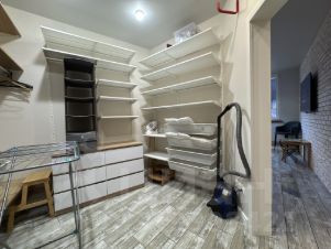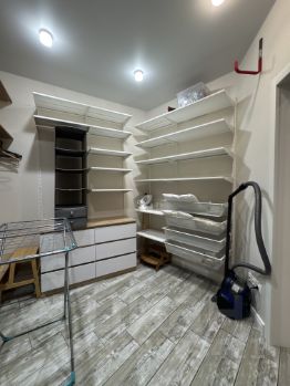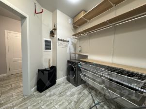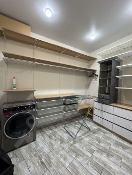 В квартире большая гардеробная 8 кв м, в которой оборудована система хранения и установлена стиральная машинка lg.