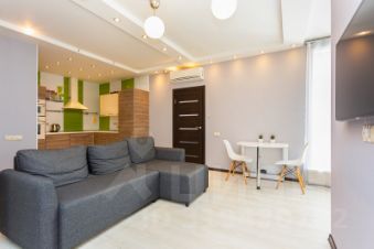 • Гостиная совмещена с кухней — здесь установлен большой диван и телевизор, идеальное пространство для отдыха.
