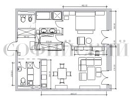 Планировка: гостиная с кухонной зоной, мастер-спальня с гардеробной и ванной. Имеется дополнительный гостевой туалет и постирочная.