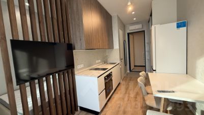 Пространство продумано до мелочей: в комнате и на кухне есть вся необходимая мебель, а также современная техника, включая кондиционер, холодильник, посудомоечную и стиральную машины, а также телевизор.