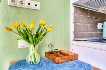 — Современная мини-кухня: плита, холодильник, микроволновка, чайник и полный набор посуды.