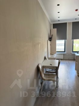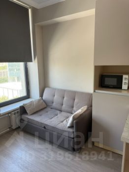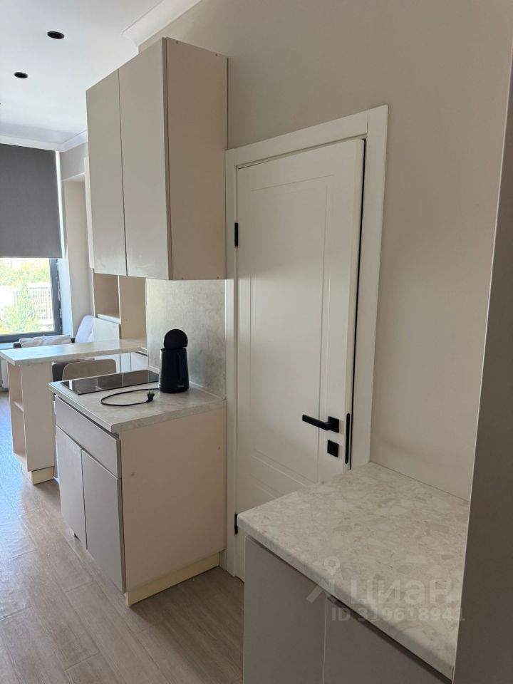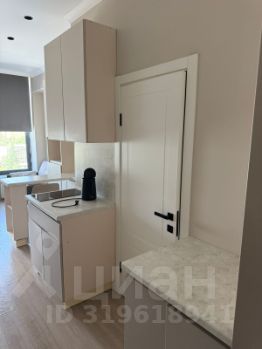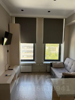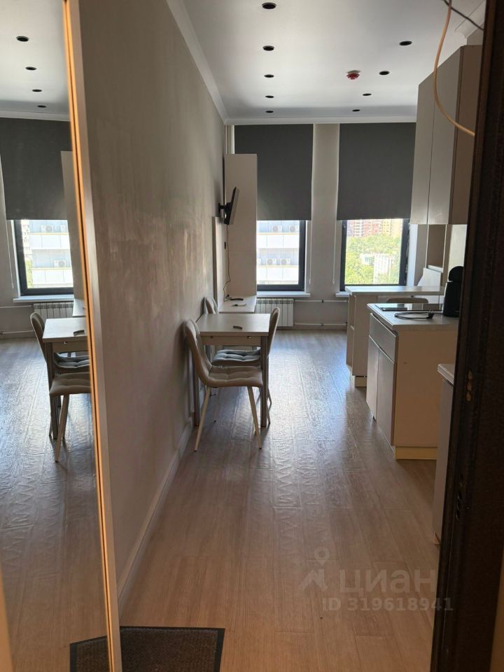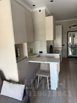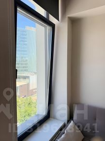 Студия выполнена в современном стиле, с высокими потолками и большими панорамными окнами.