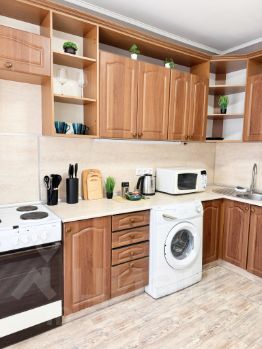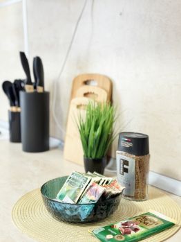 — Полноценная кухня: плита, микроволновка, холодильник, набор посуды, кофе, чай, конфеты и базовые специи уже ждут
