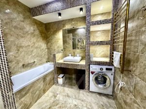 Современная бытовая техника, в гостиной роскошный Тв 75 Samsung с приставкой. (250 каналов). Большая широкая ванная, сантехника премиального бренда Jackob Delafon. Высокоскоростной интернет. есть возможность арендовать машиноместо в паркинге на верхнем уровне( идёт лифт).