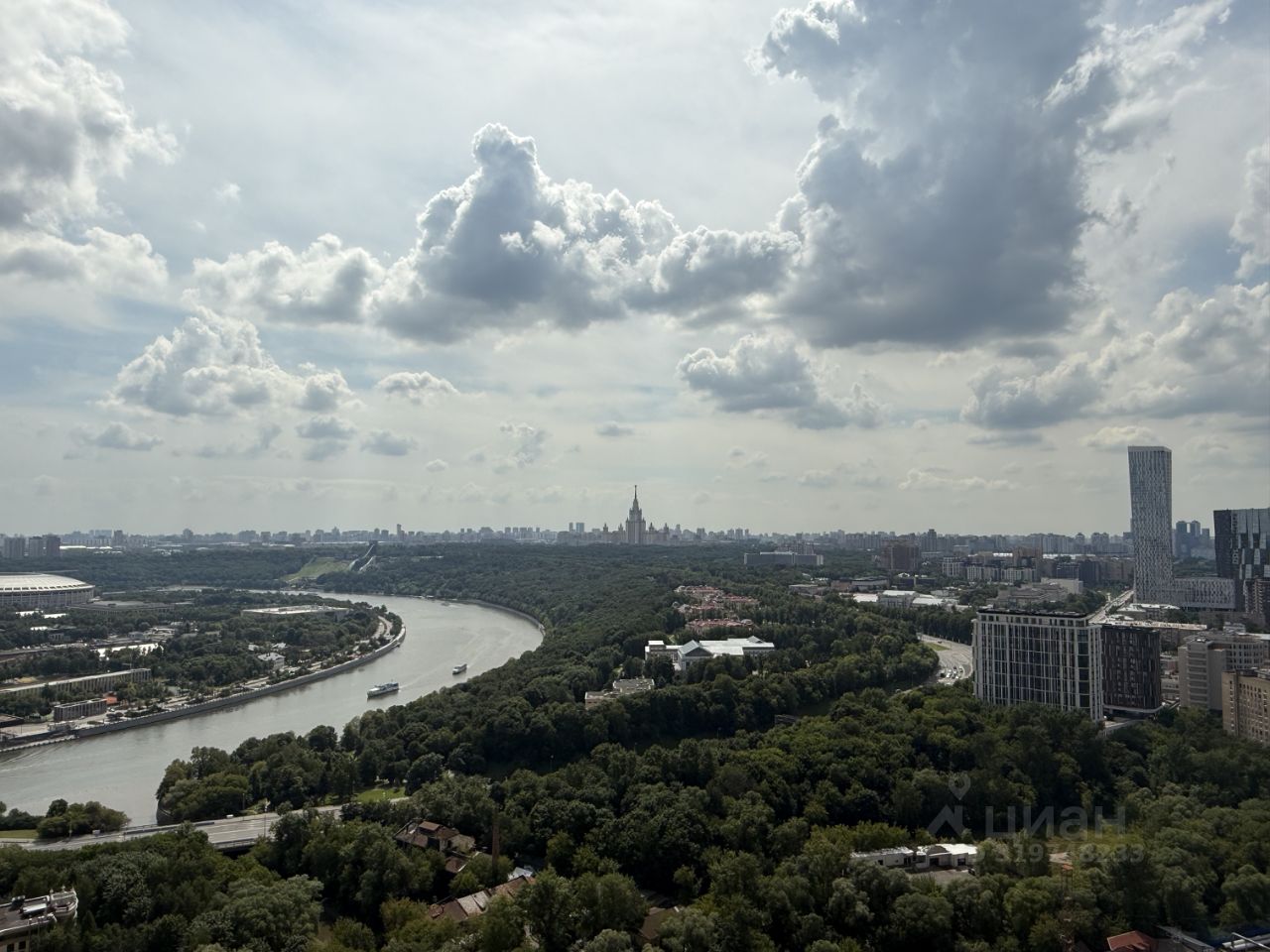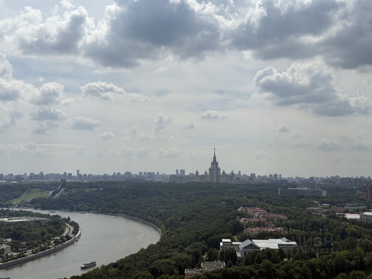 Вид из окон — на МГУ, Воробьёвы горы и панораму города.