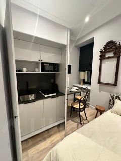 оборудованная мини кухня ( чайник, микроволновка, плита, вся необходимая посуда)