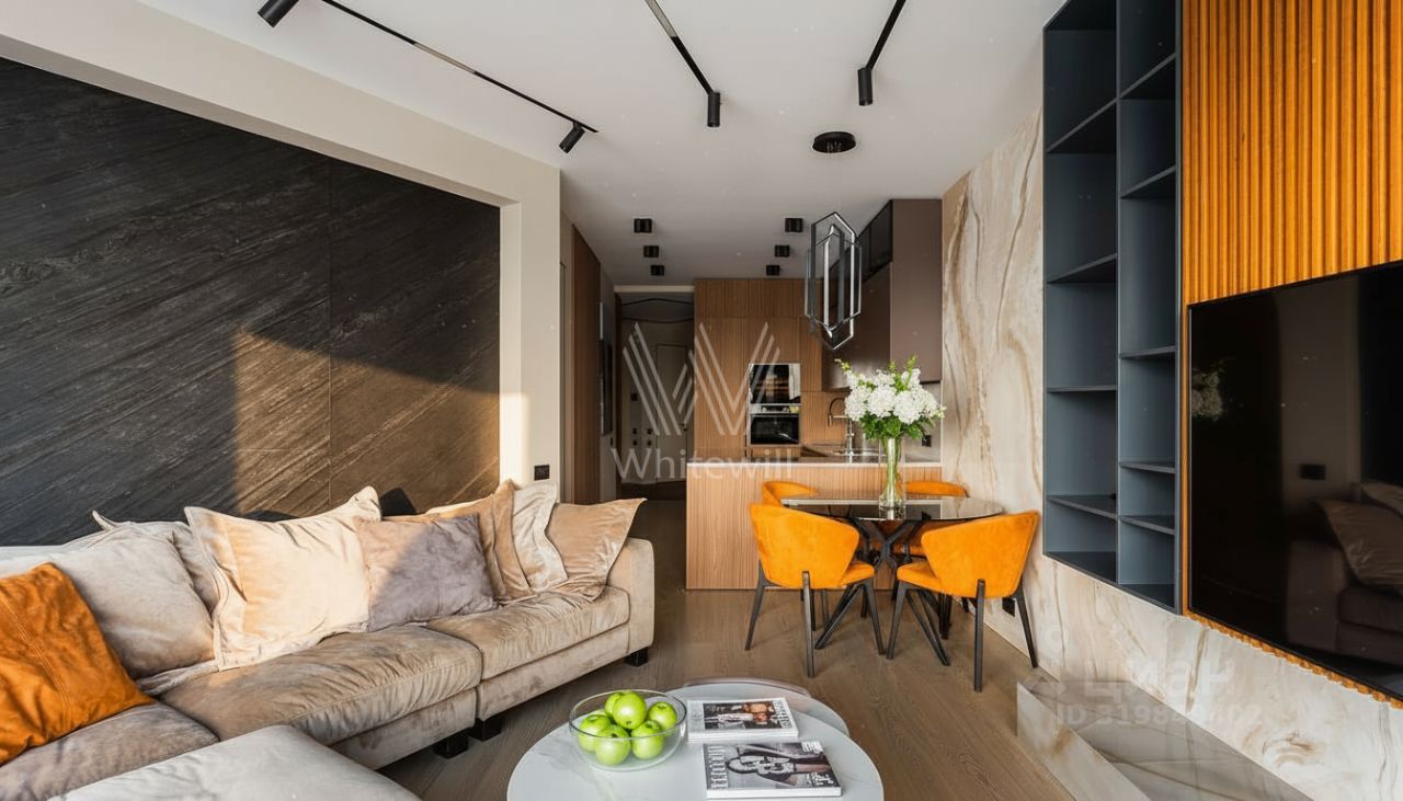 Гостиная с акцентным оранжевым на фоне бежевого камня — словно в карамель добавили цедру апельсина. Здесь приятно расслабиться на диване и запустить новый сезон любимого сериала на "Нетфликсе".