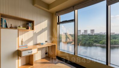 Главное о квартире: шестой этаж, 127 м², три спальни, включая две детские, четыре санузла, панорамные окна в пол, захватывающие виды на реку из каждой комнаты. Большая гардеробная в прихожей. Кровати-трансформеры в детских. Стирка и сушка в постирочной Asko.