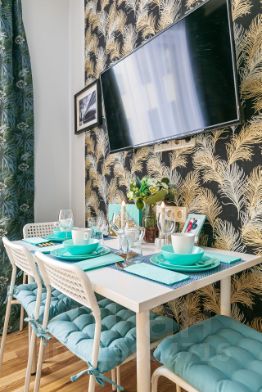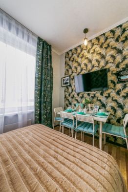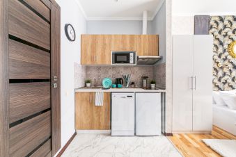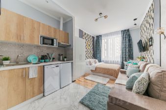 Студия полностью оборудована для комфортного проживания: телевизор, бесплатный Wi-Fi, стиральная машина, утюг, фен, варочная панель, чайник и микроволновка. Есть штопор и бокалы. Регулярная уборка профессиональной химией и дезинфекция от насекомых, а также смена белья на чистое и свежее проводятся перед каждым заездом.