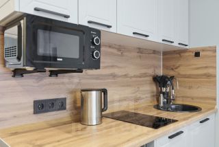 - Кухня с холодильником, плитой, микроволновкой, чайником и посудой