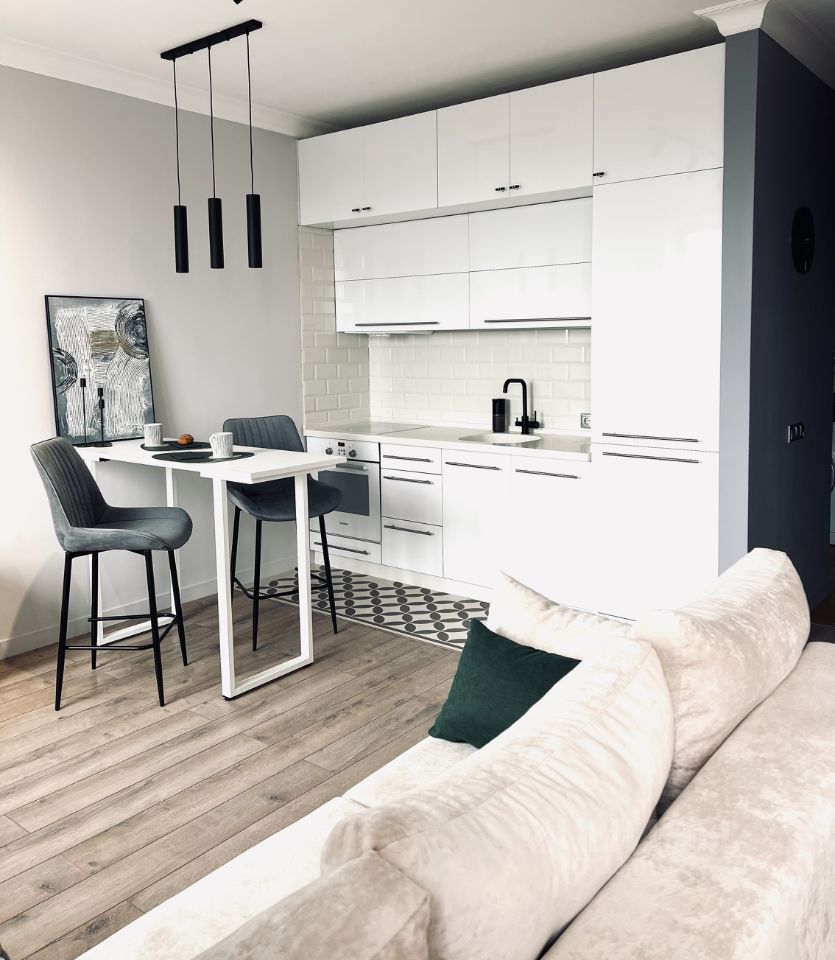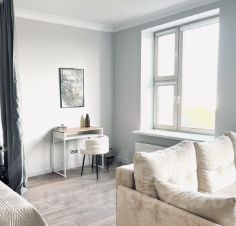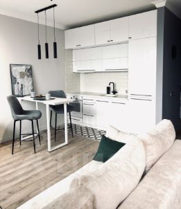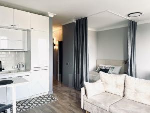 В квартире - кухня-гостиная, большая гардеробная и совмещенный санузел.