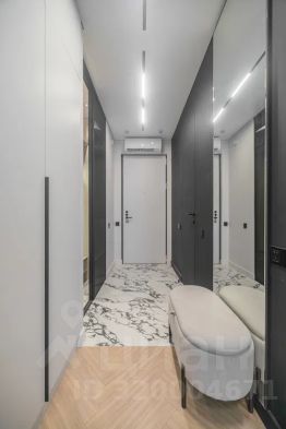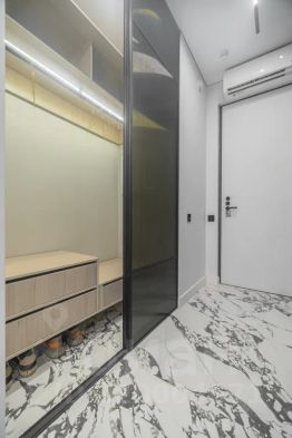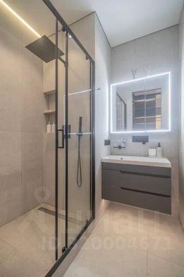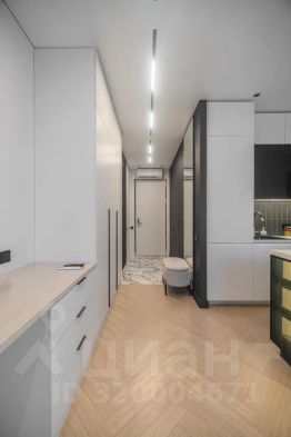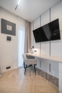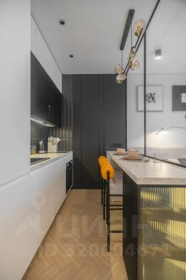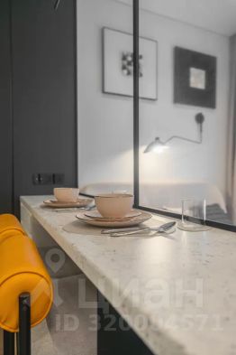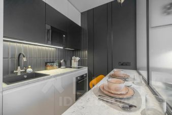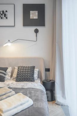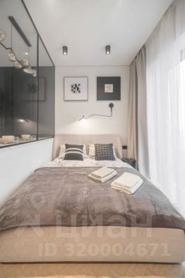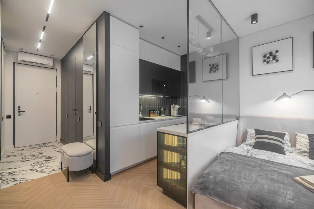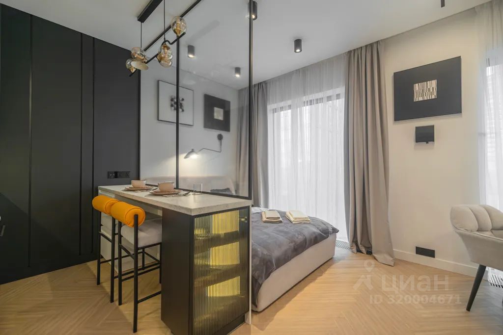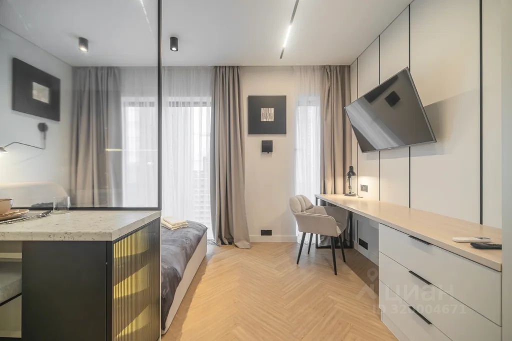 Просторная, светлая квартира - студия с остеклением в пол и свежим дизайнерским ремонтом с интересными и стильными акцентами в спокойных тонах.