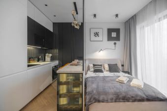 В апартаментах комфортно может разместиться до 2-ух гостей. Широкая двуспальная кровать с супер удобным ортопедическим матрасом. А так же, все, что нужно, что бы чувствовать себя как дома: