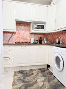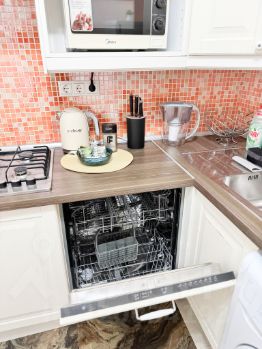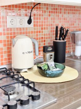 — Полноценная кухня: плита, микроволновка, холодильник, набор посуды, кофе, чай, конфеты и базовые специи уже ждут
