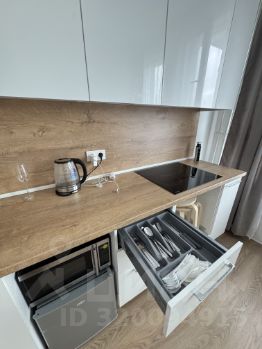 - Полноценная кухня с техникой (индукция, холодильник, микроволновка), посудой и столовой зоной.
