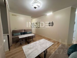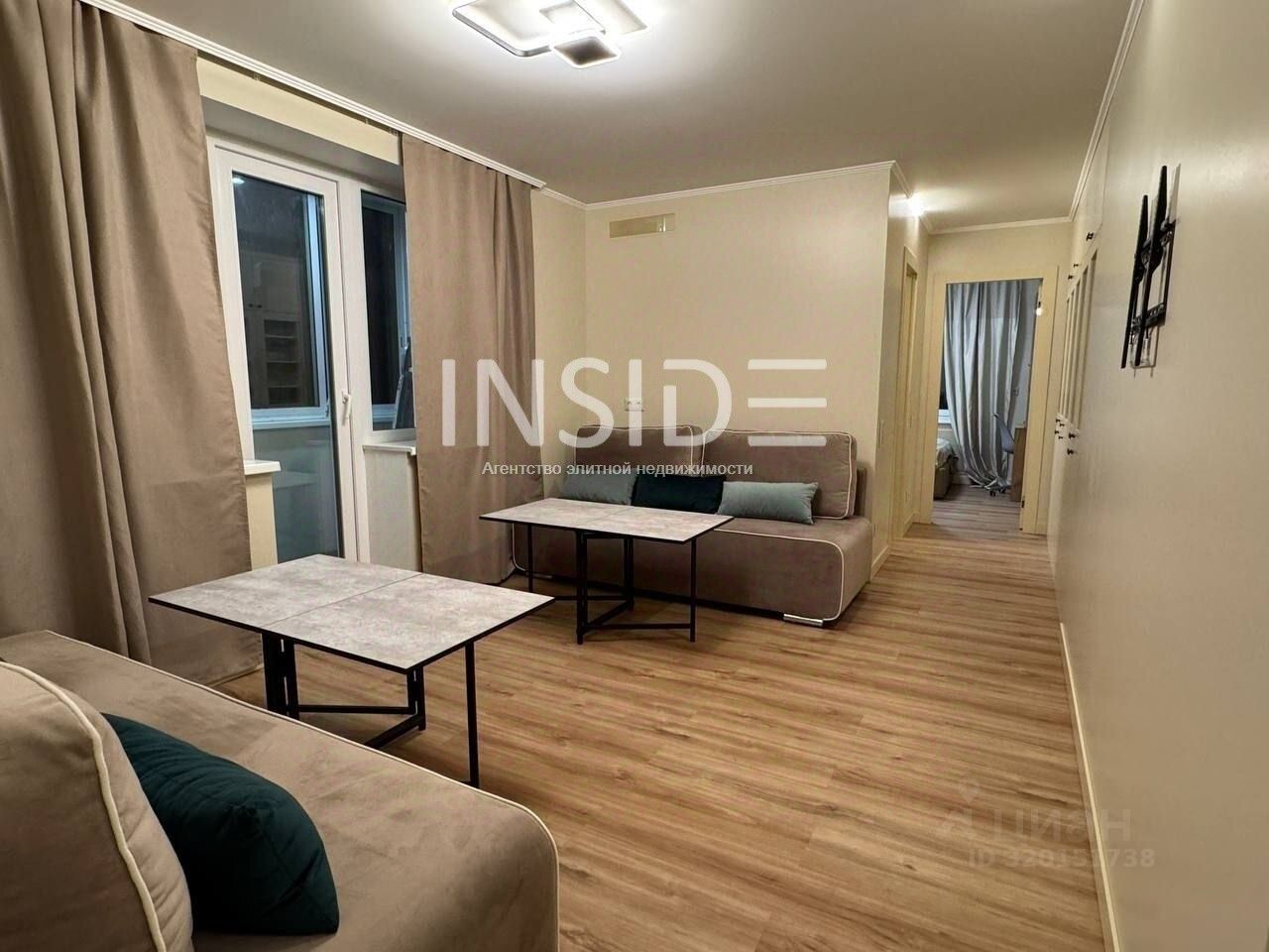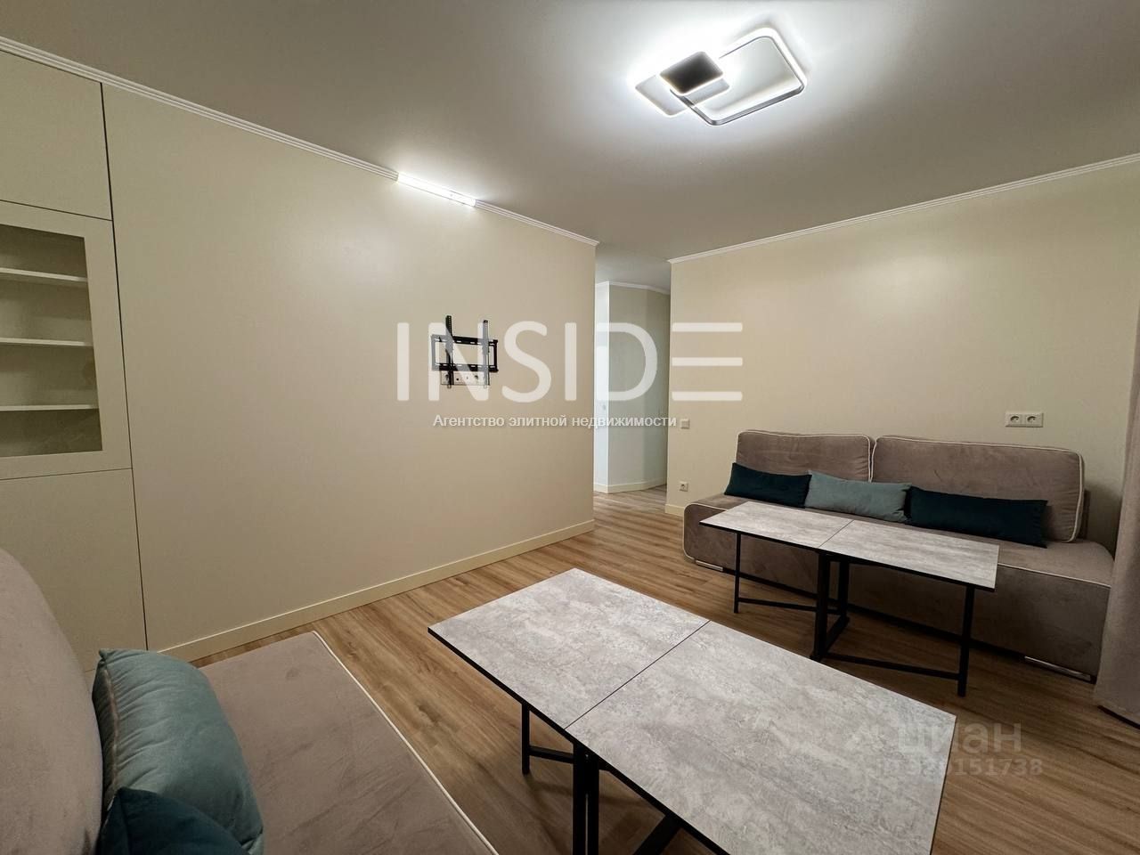 Гостиная: 2 трехместных раскладных дивана (с местом хранения), 2 журнальных столика, книжный шкаф, ТВ-зона, домофон. Балкон с сушкой для белья