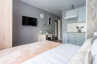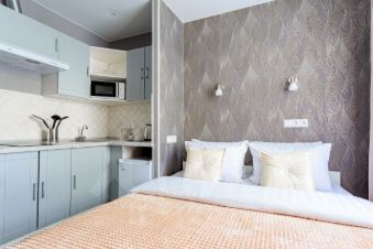 Студия полностью оборудована для комфортного проживания: телевизор, бесплатный Wi-Fi, стиральная машина, утюг, фен, варочная панель, чайник и микроволновка. Есть штопор и бокалы. Регулярная уборка профессиональной химией и дезинфекция от насекомых, а также смена белья на чистое и свежее проводятся перед каждым заездом.