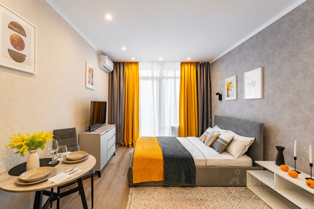 Представьте: тихий вечер, закатное солнце заливает уютную лоджию вашей квартиры-студии, оформленной в спокойных серо-горчичных тонах, в новом ЖК "Beside"