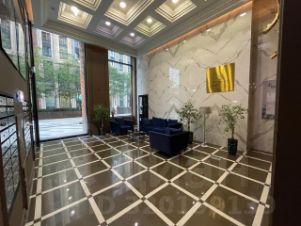 Просторное лобби с диваном, креслами, мраморным столом, для встреч с гостями.